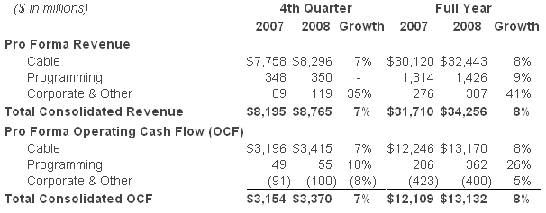 For the quarter ended December 31, 2008, revenue from the Cable segment increased 7% to $8.3 billion and Operating Cash Flow increased 7% to $3.4 billion, a margin of 41.2%. Excluding the impact of the hurricanes and severance-related charges, which were $19 million and $63 million, respectively, Operating Cash Flow grew 9% in the fourth quarter of 2008.