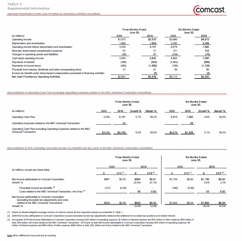 Earnings per Share1 (EPS) for the quarter ended June 30, 2010 was $0.31, a 6.1% decrease from the $0.33 reported in the second quarter of 2009, reflecting growth in Consolidated Operating Cash Flow, offset primarily by costs related to the NBC Universal transaction and income tax benefits included in last year's results. Excluding these items, second quarter 2010 EPS would have grown 13.8% over the comparable period in 2009.